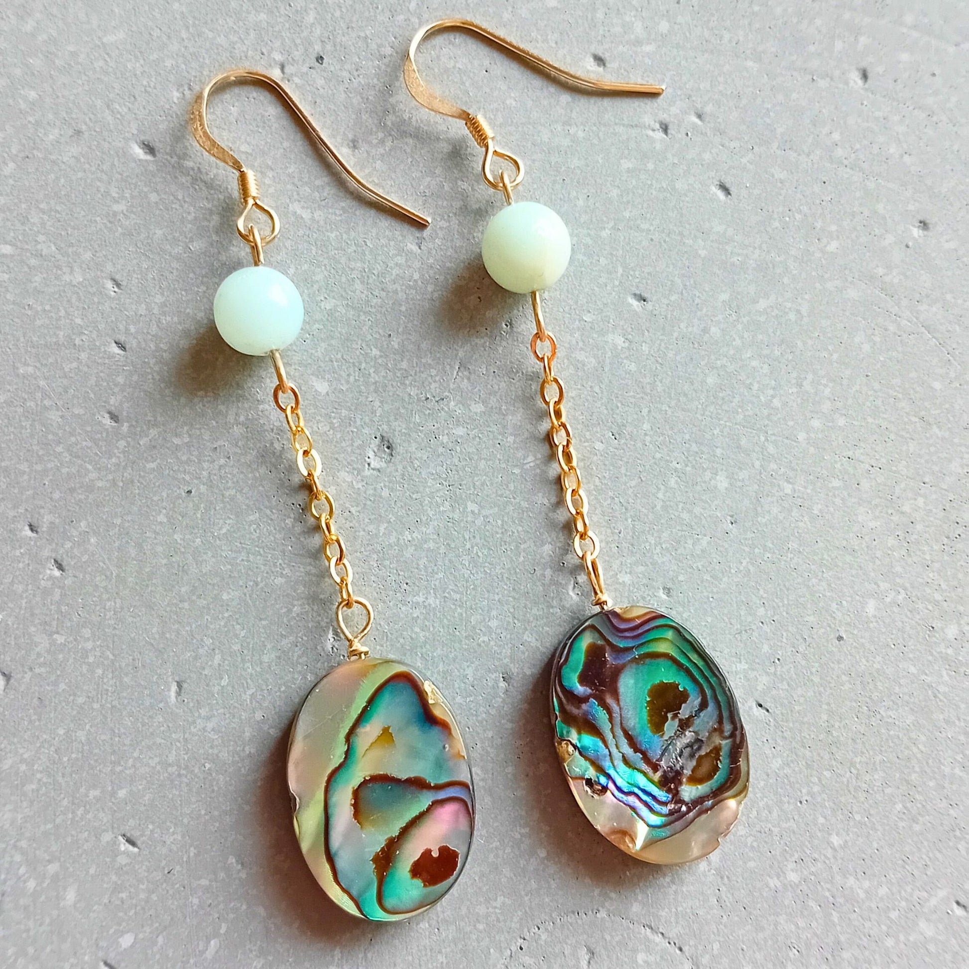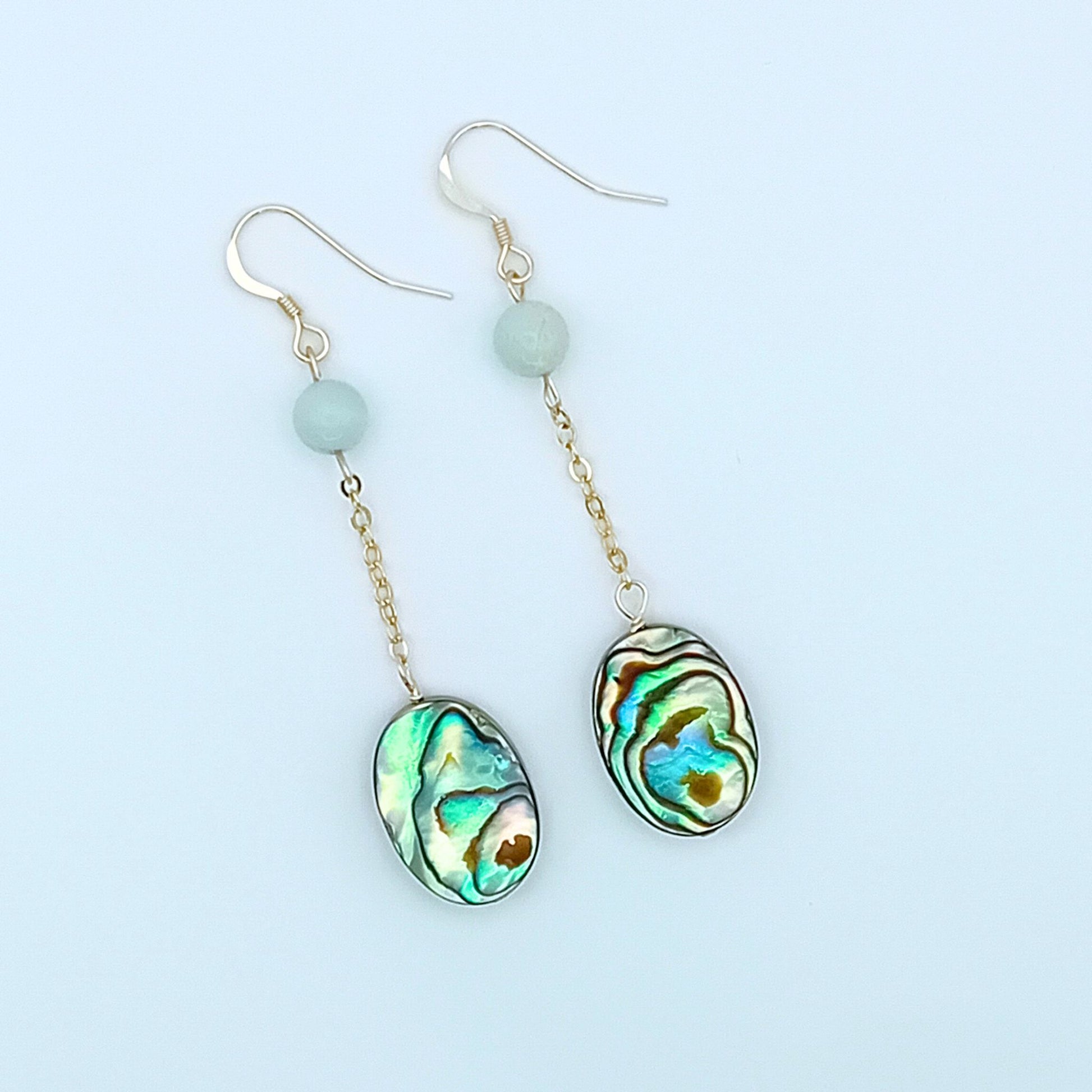 These Boho style earrings combine the stunning iridescent colours of Abalone shell with beautiful semi-opaque Amazonite stones to make the perfect drop earrings for your collection! The abalone shell drops from a durable 14k gold fill chain.