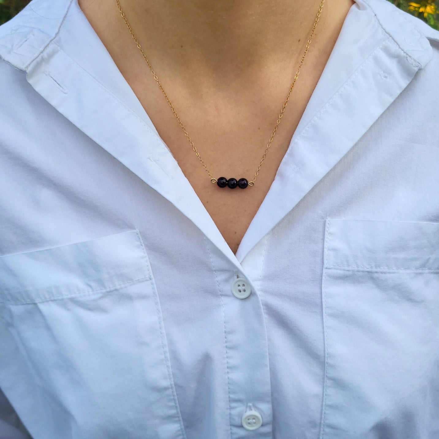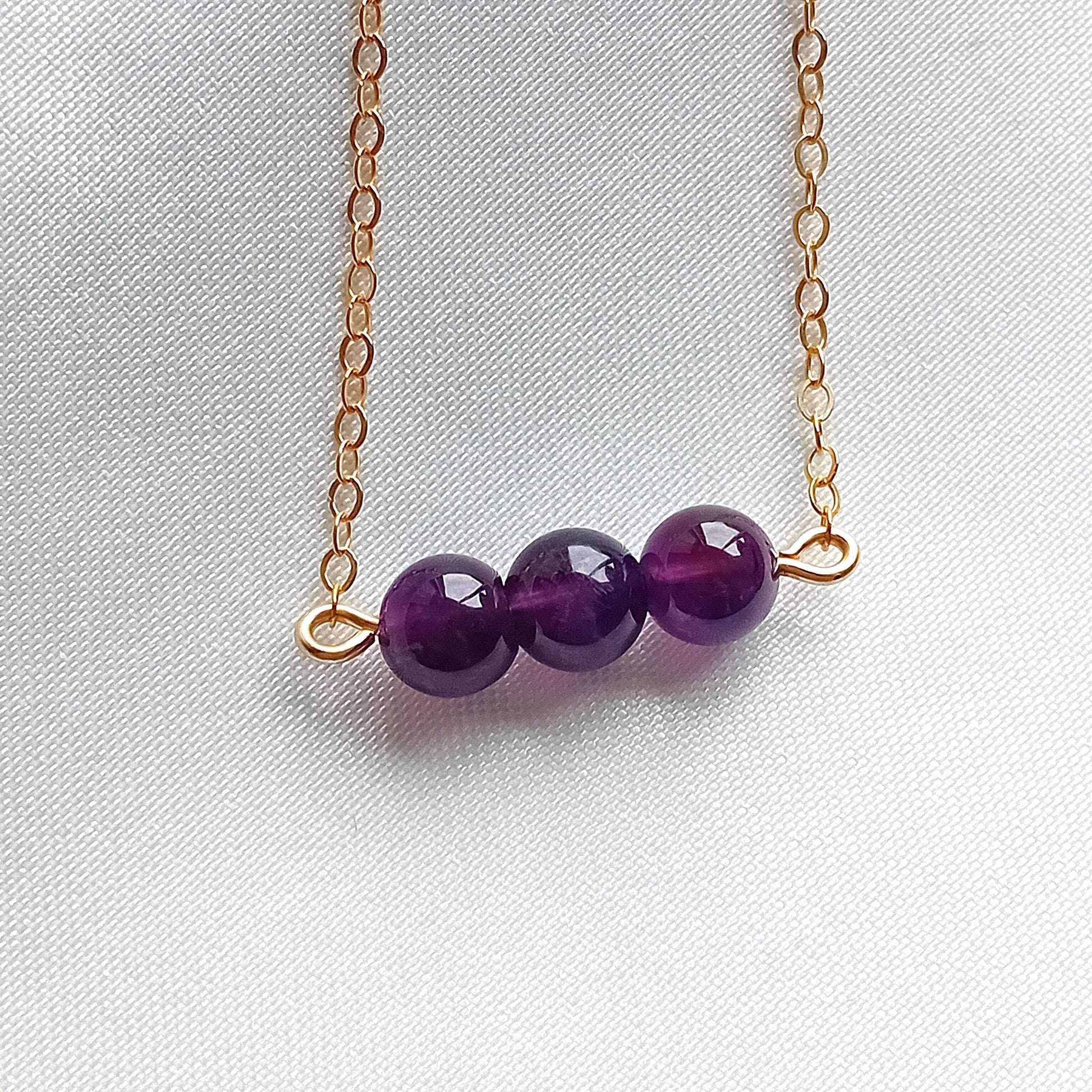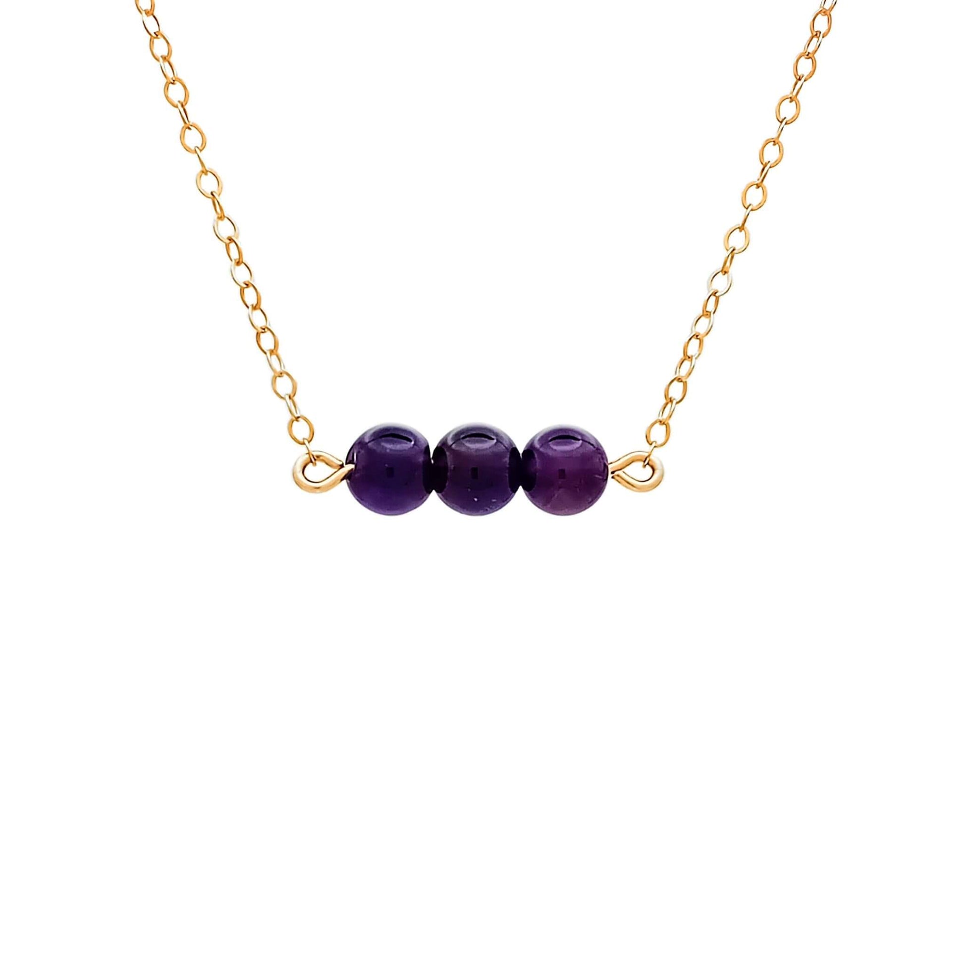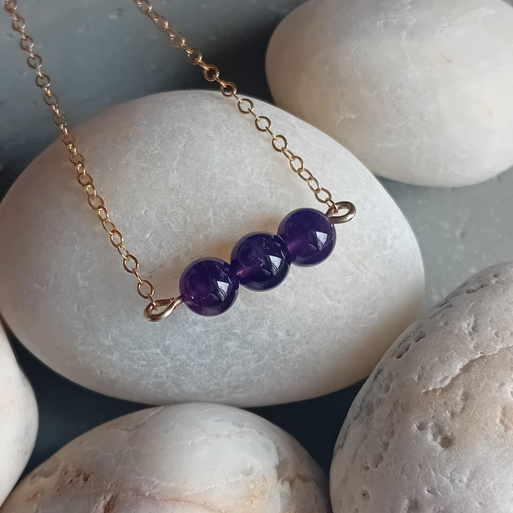 This necklace is made using three stunning Amethyst gemstones which have been carefully selected for their deep purple hue and natural sparkle. The rich colour of these amethysts contrasts brilliantly with the 14k gold fill chain.