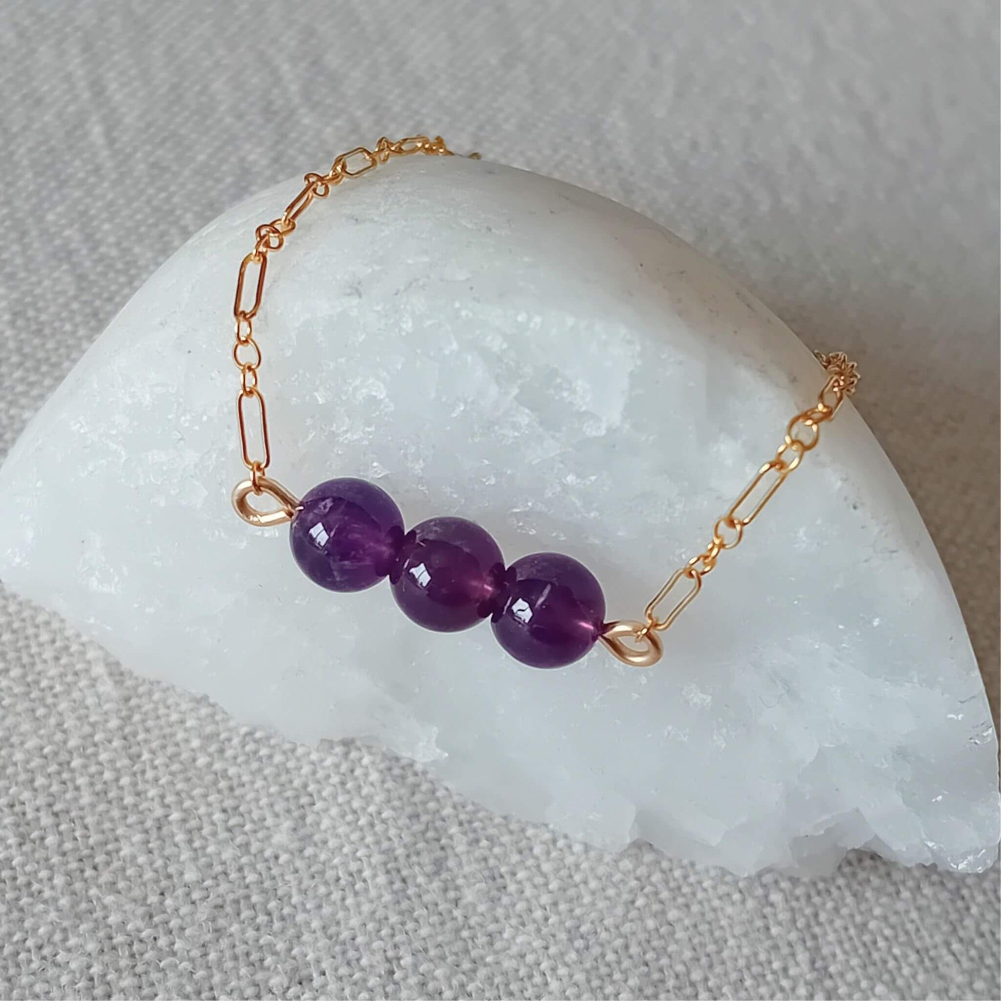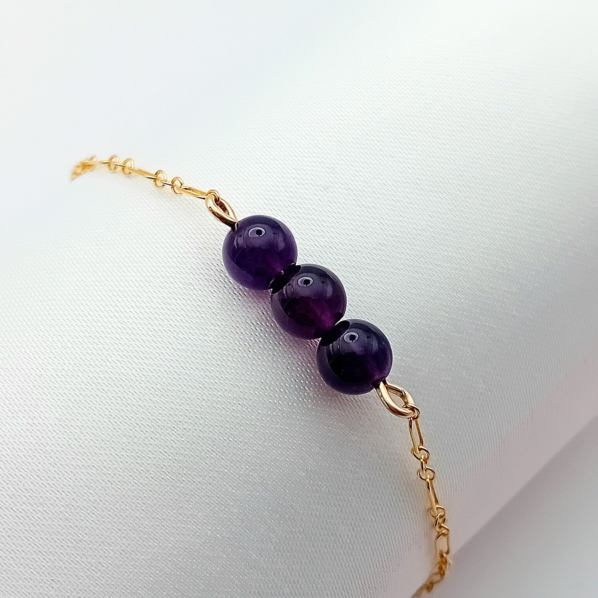 This bracelet is made using three stunning Amethyst gemstones which have been carefully selected for their deep purple hue and natural sparkle. The rich colour of these amethysts contrasts brilliantly with the 14k gold fill chain which is a dainty figaro design.