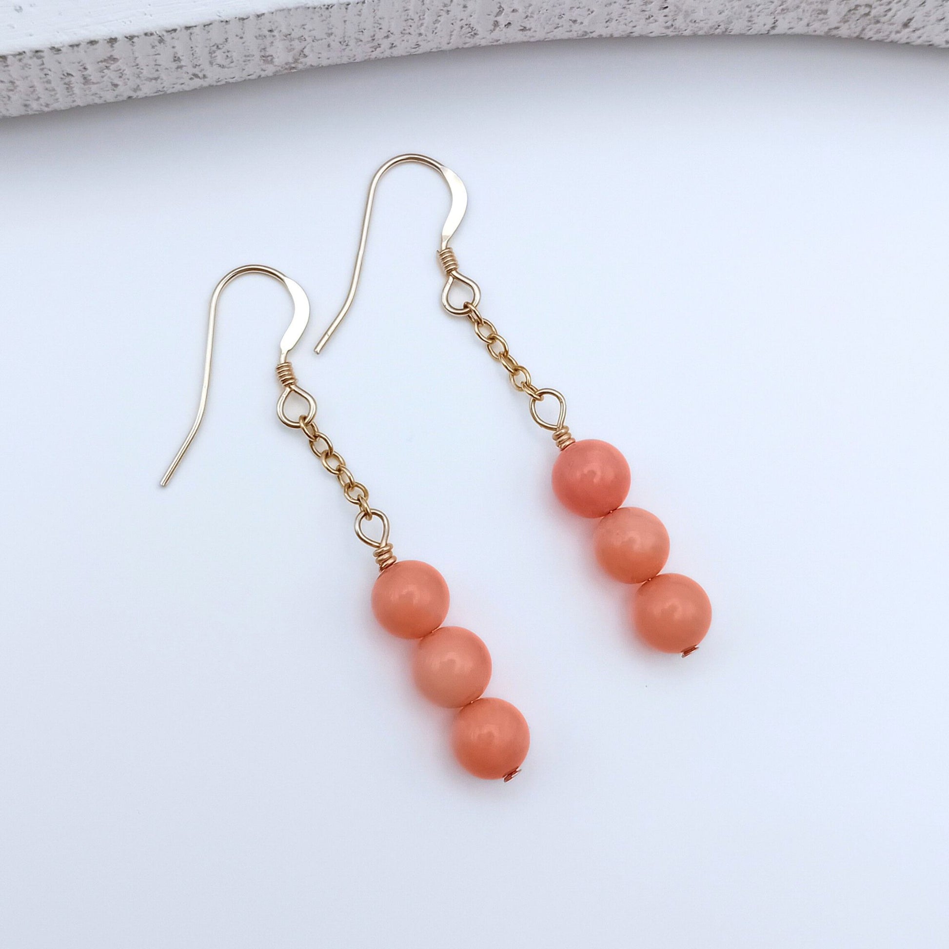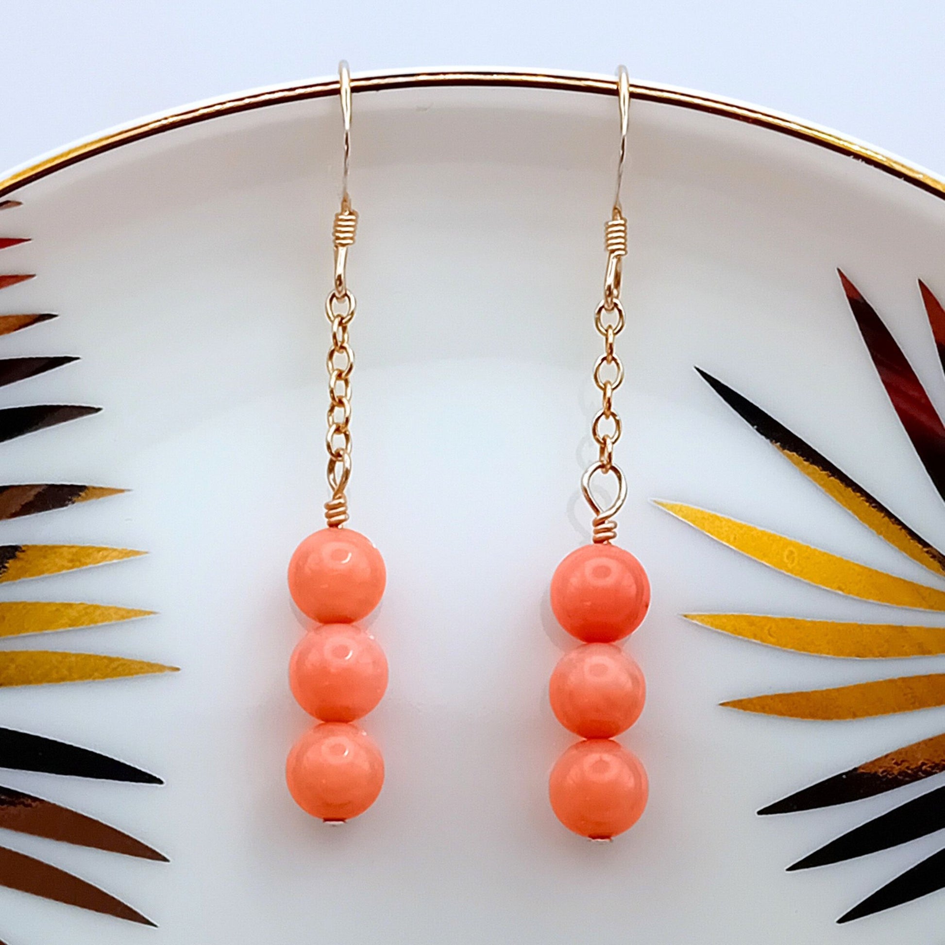 Handcrafted Coral drop earrings with three vibrant coral beads, delicately stacked and suspended from shimmering 14k gold fill chain for a timeless, minimalist look.
