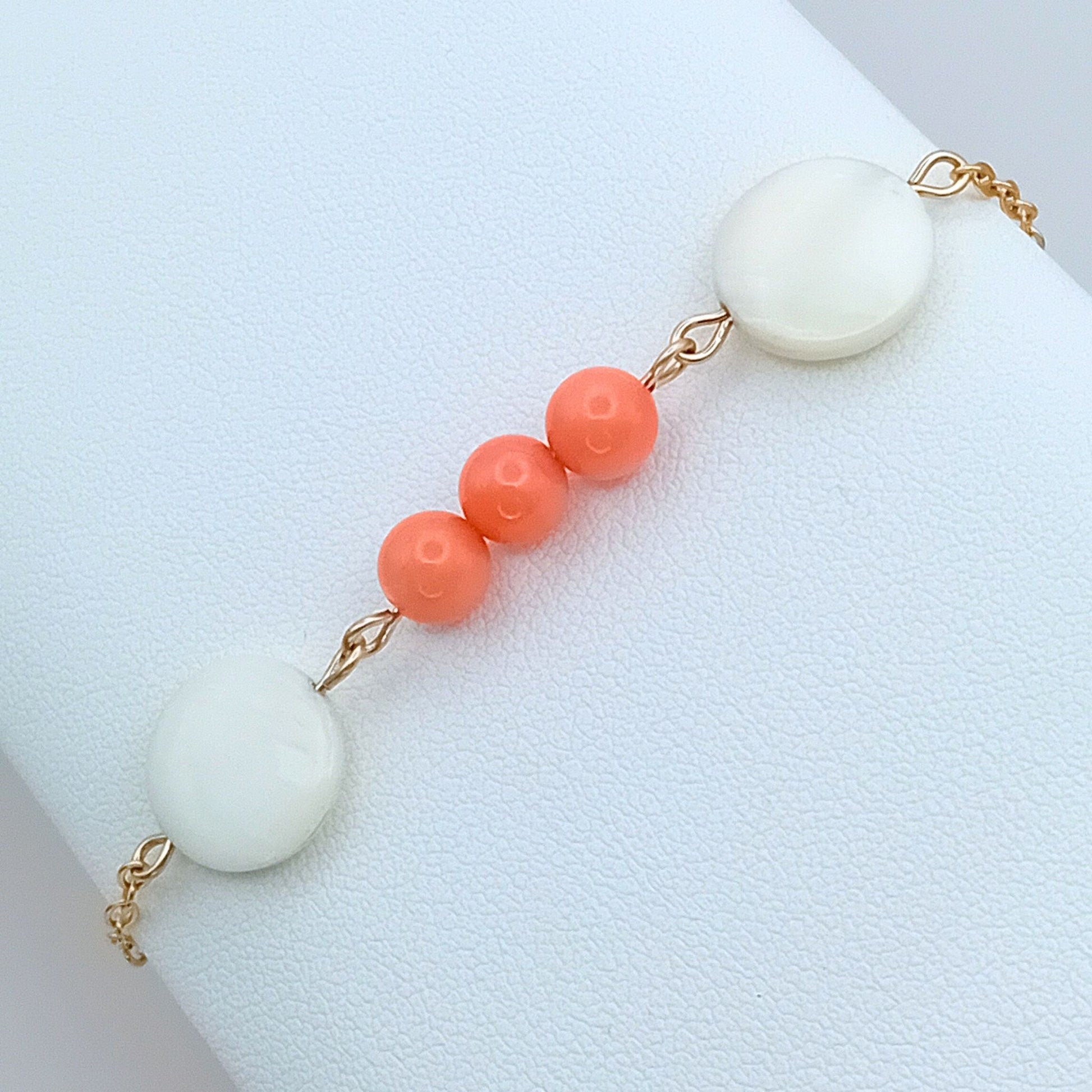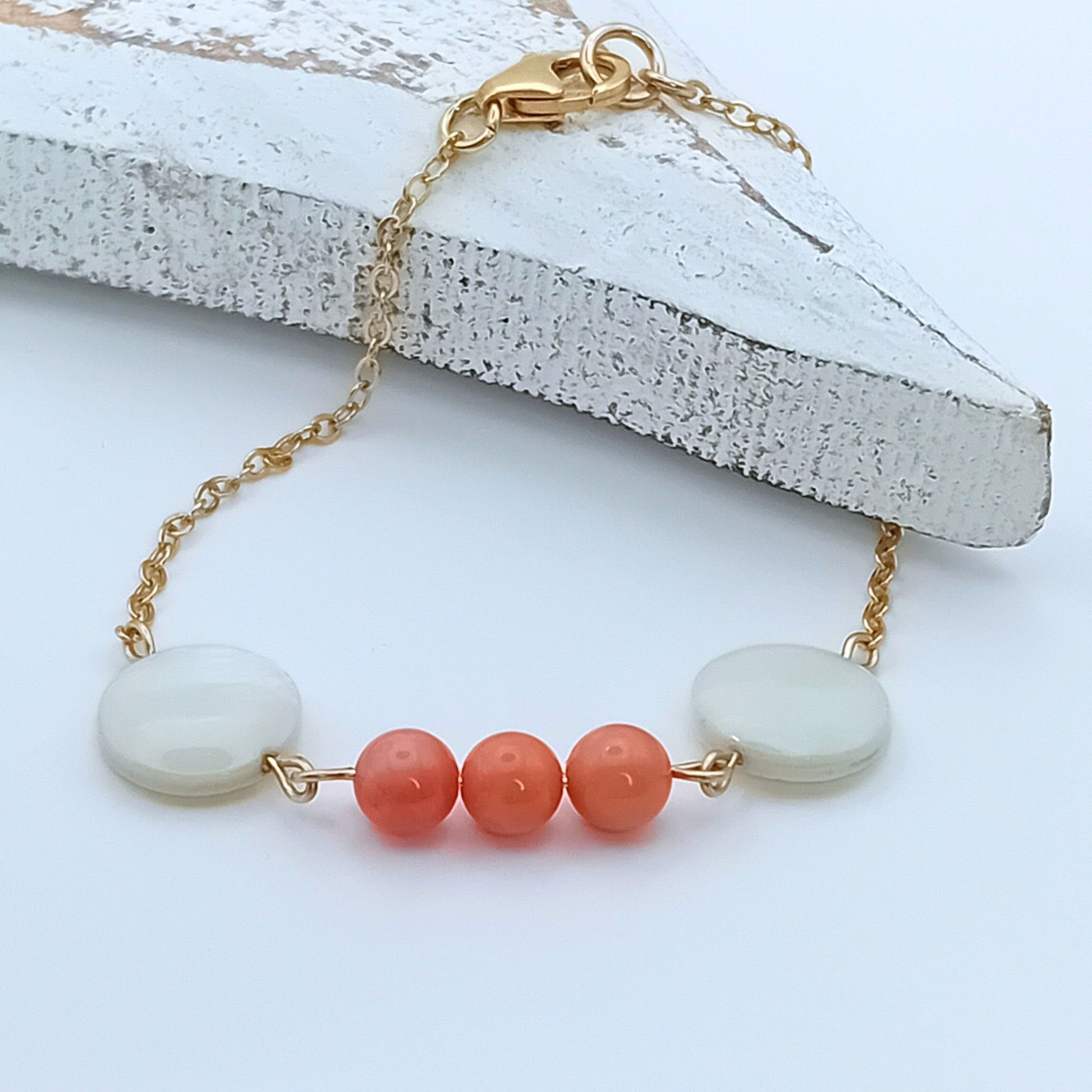 A delicately handcrafted bracelet, featuring three vibrant coral beads at the centre and shimmering mother of pearl discs on each side. Handmade for your everyday, using a durable, tarnish resistant 14k gold fill chain.