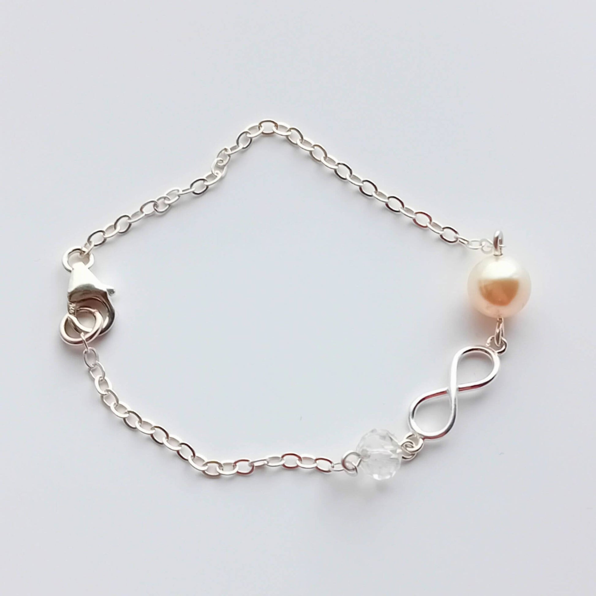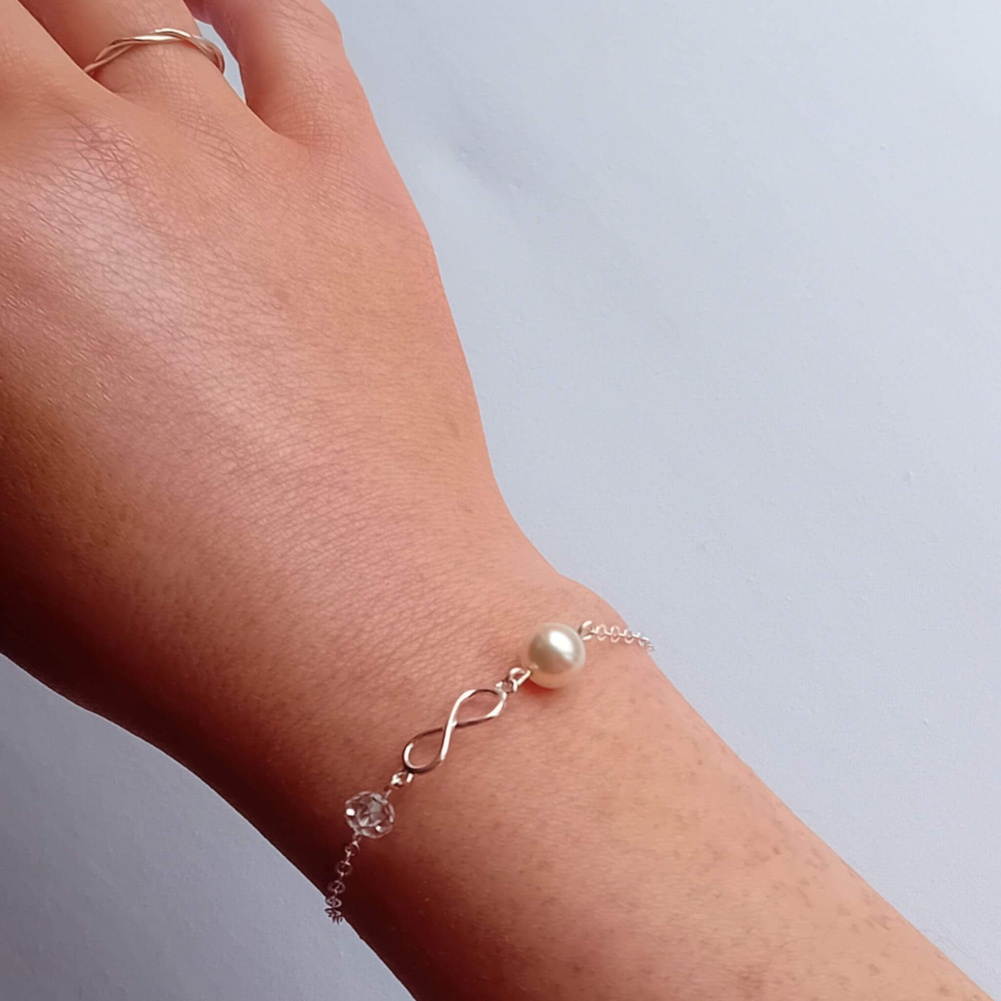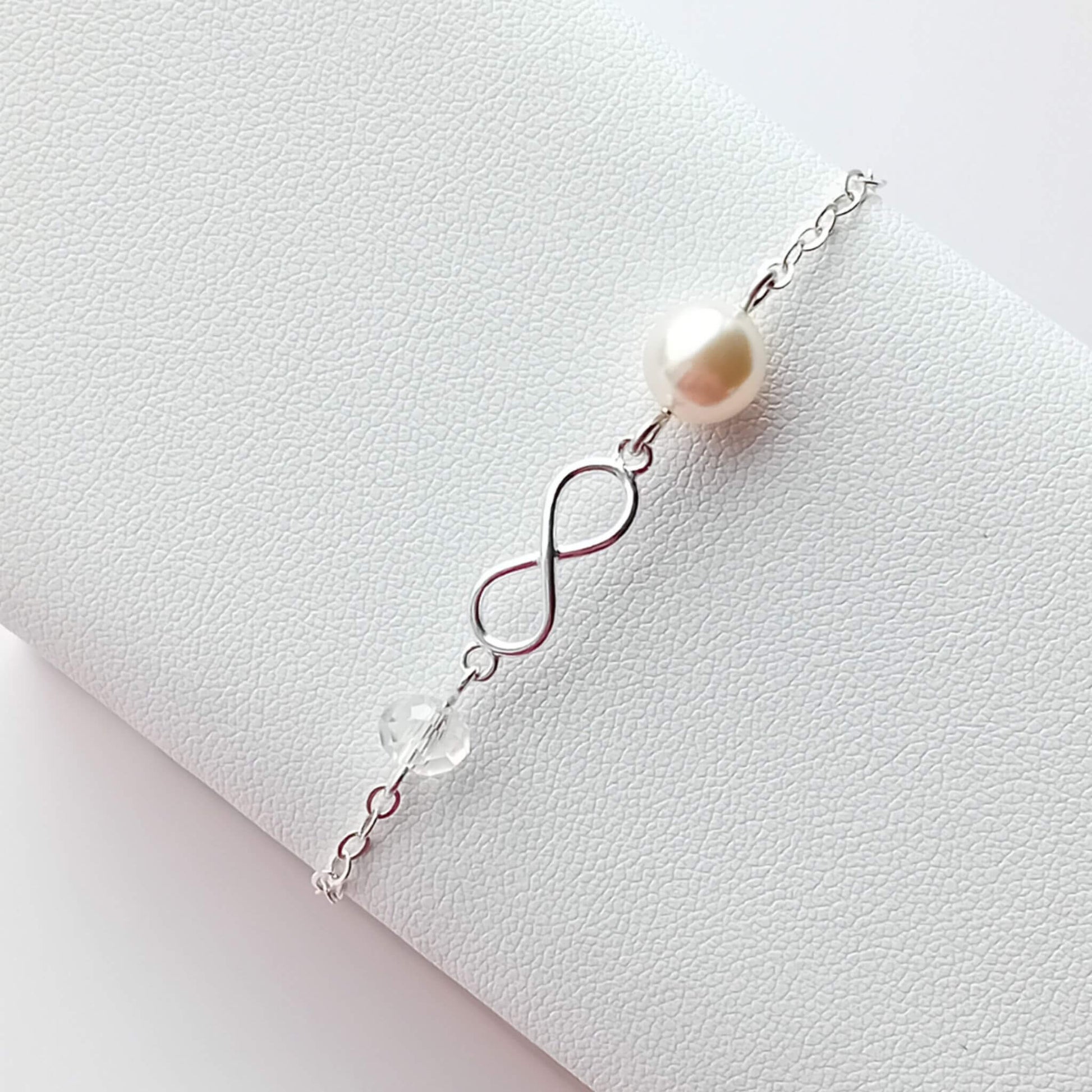 The Infinity Crystal Bracelet is handmade with a cream Swarovski pearl, a sparkling clear crystal and a sterling silver infinity symbol. This bracelet is a symbol of love and friendship, making it the perfect accessory for brides, a meaningful gift for bridesmaids or a thoughtful gift for someone special. Wear it on its own or with the matching Infinity Crystal necklace and Infinity Crystal earrings.
