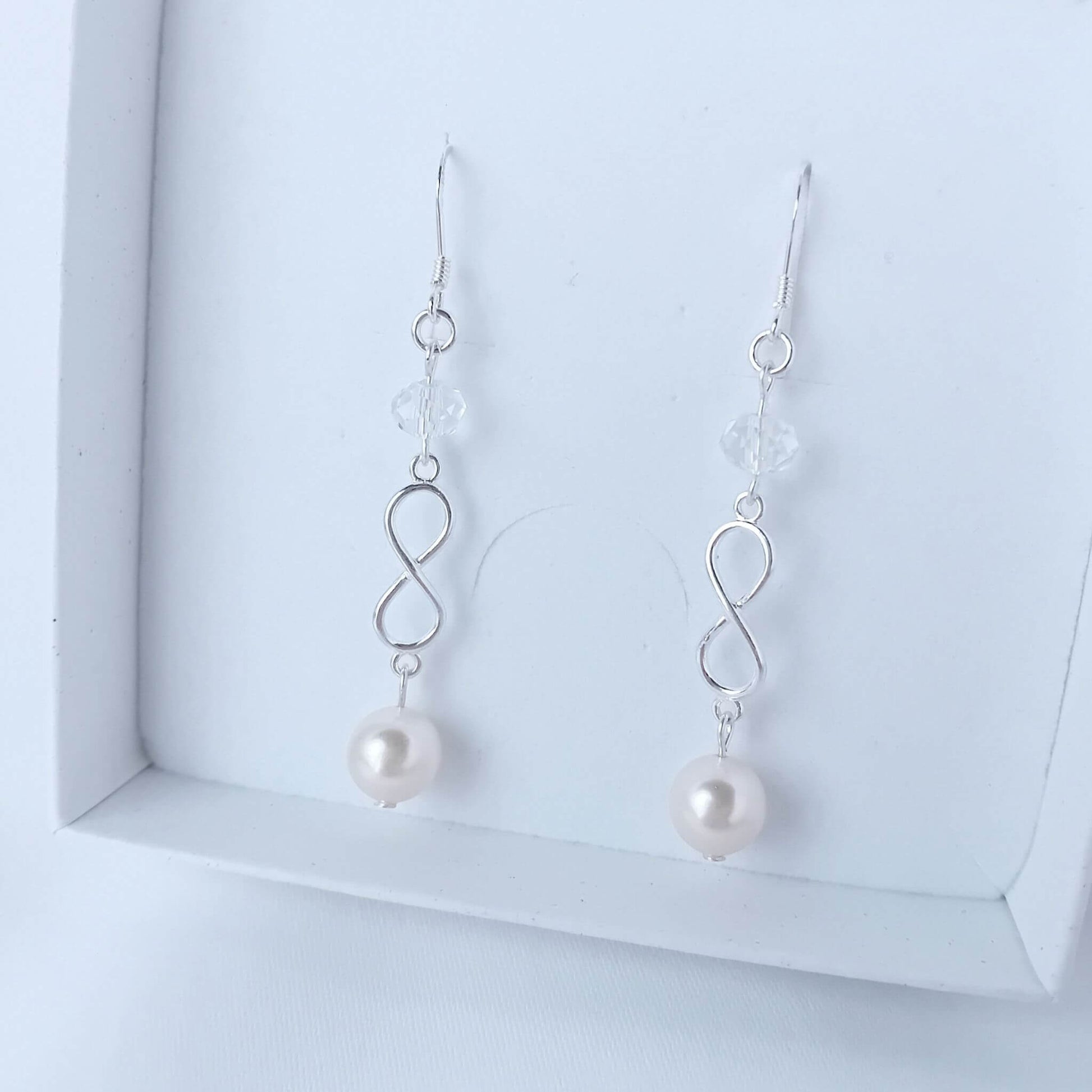 The Infinity Crystal earrings are beautifully handmade, featuring a Swarovski pearl, a sparkling clear crystal and a delicate sterling silver infinity symbol. A timeless symbol of love and connection, these infinity earrings are the perfect accessory for brides on their wedding day. They’re also an ideal gift for bridesmaids or a thoughtful present for someone special. Style them on their own or pair them with the matching Infinity Crystal necklace and Infinity Crystal bracelet.
