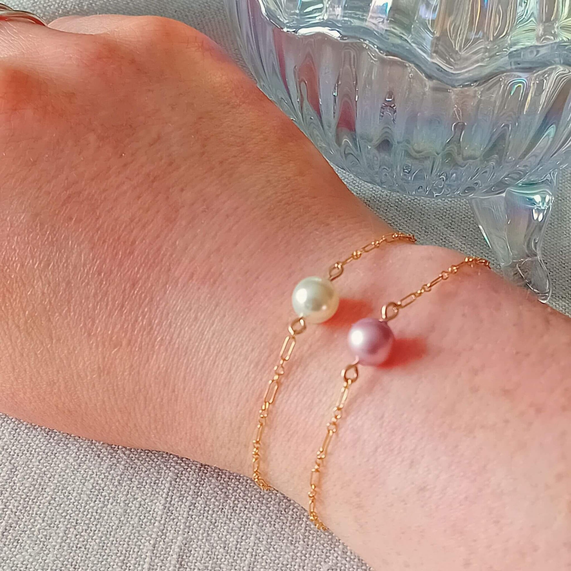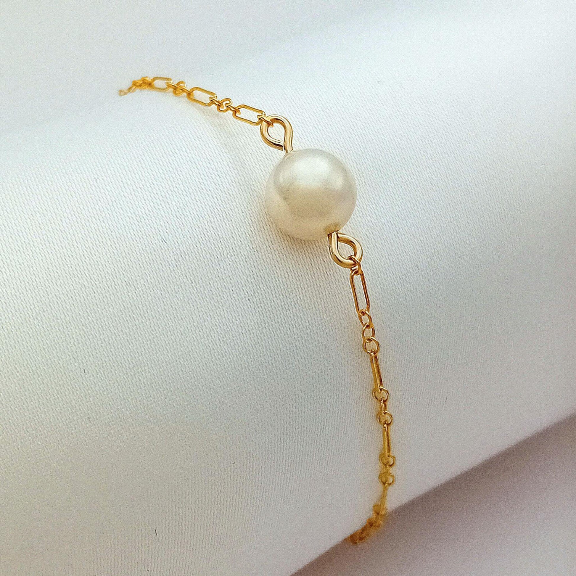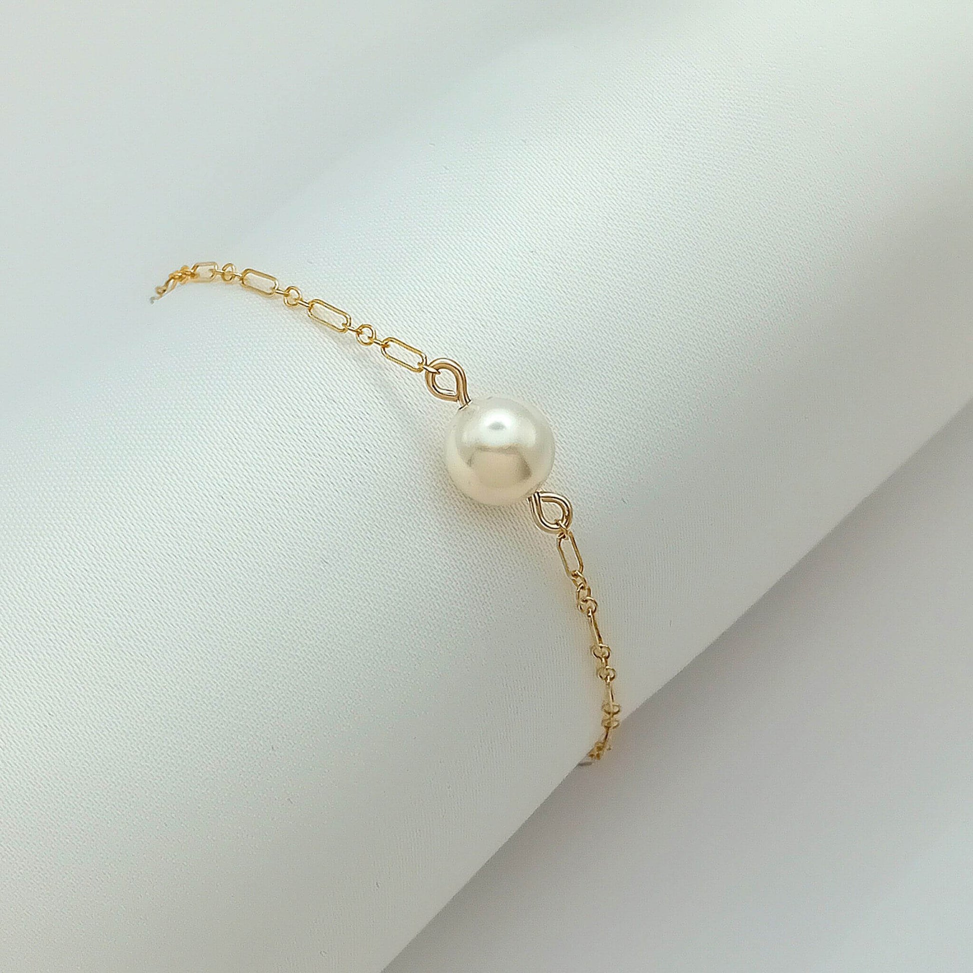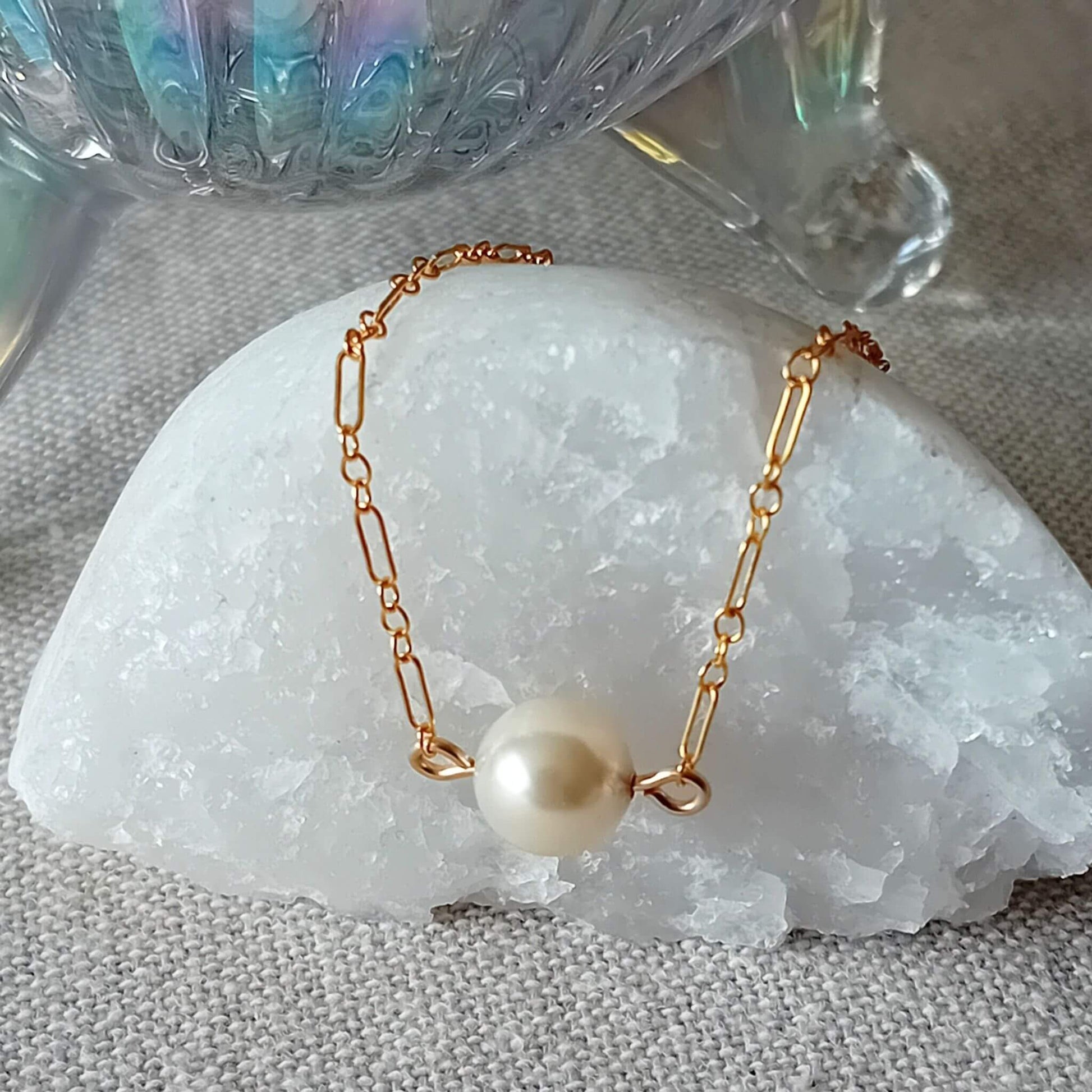 A striking, minimalist bracelet featuring a single ivory-coloured Swarovski pearl set on a figaro gold fill chain, complete with a 14k gold fill clasp. Delicate but durable, this chain is designed to withstand daily wear, making it a reliable addition to any jewellery collection.