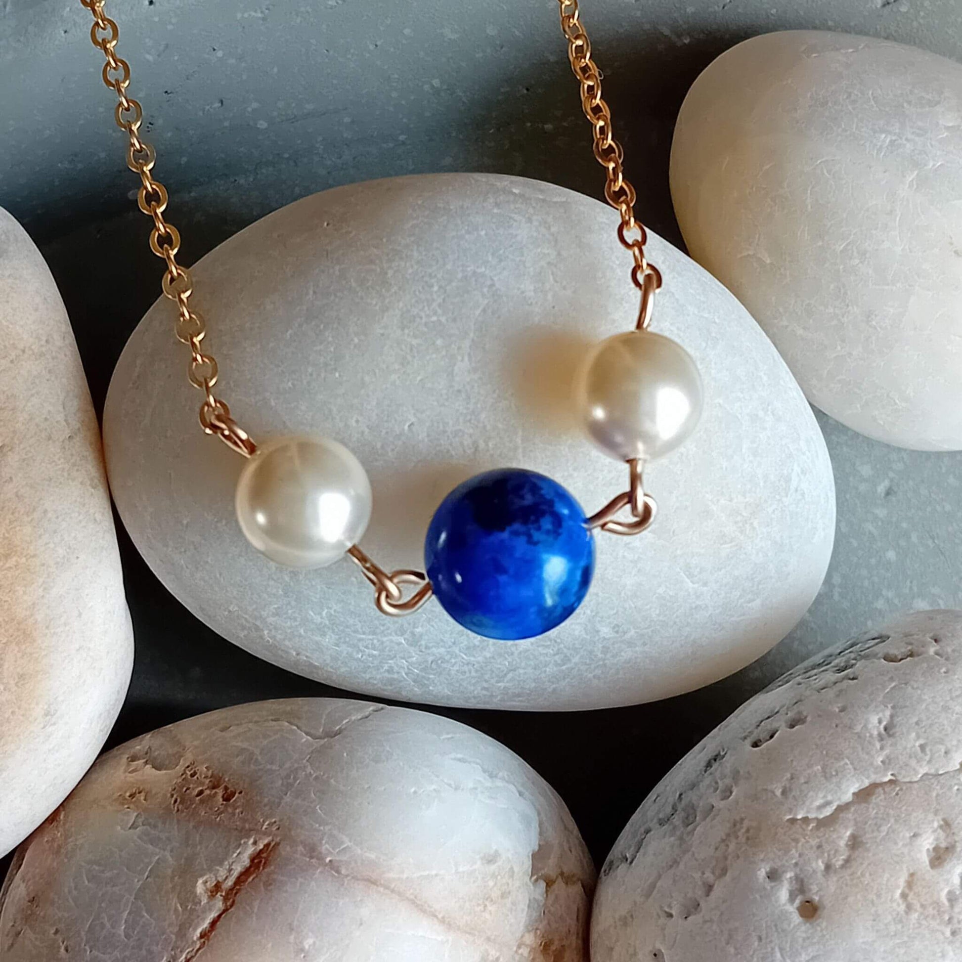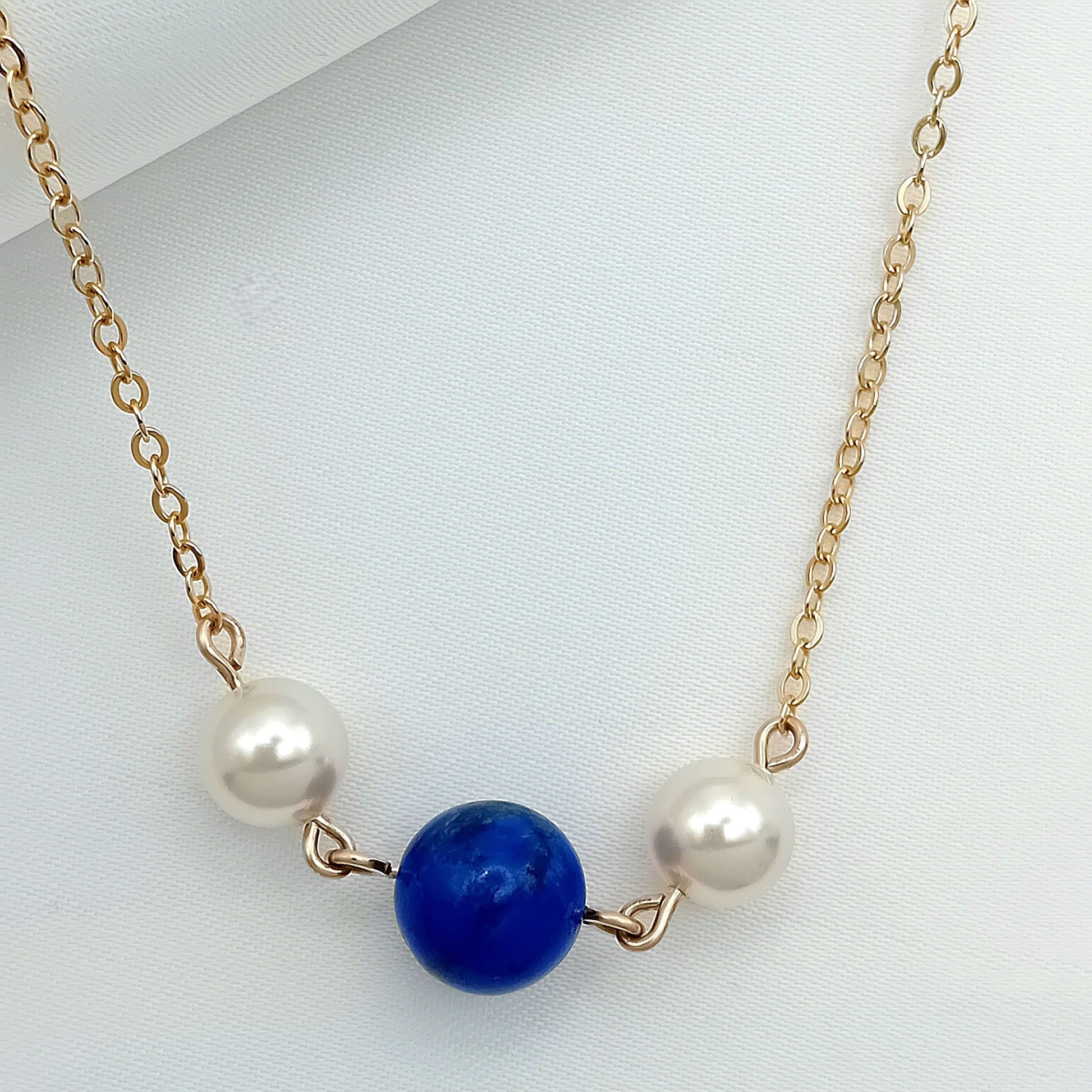 This unique necklace features a deep blue Lapis lazuli gemstone, paired with two stunning Ivory Swarovski Pearls, all set on a delicate 14k Gold Fill chain. The rich, natural beauty of the Lapis lazuli features flecks of gold and is beautifully complemented by the luminous Ivory Swarovski Pearls.