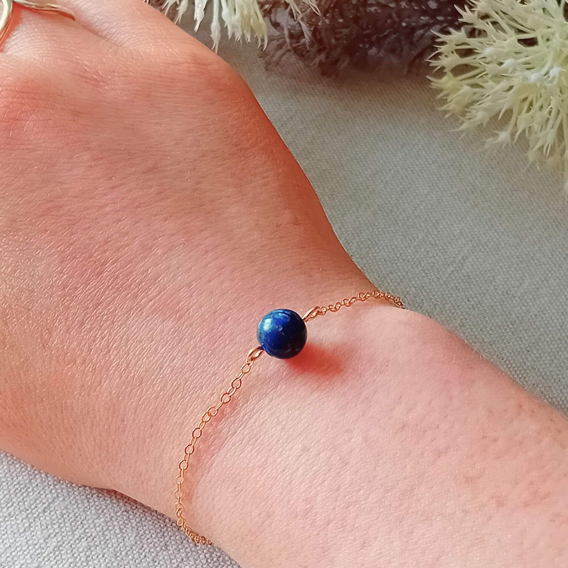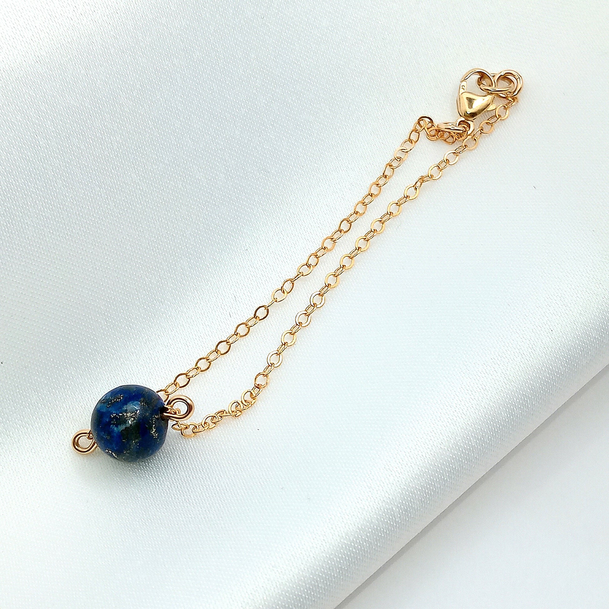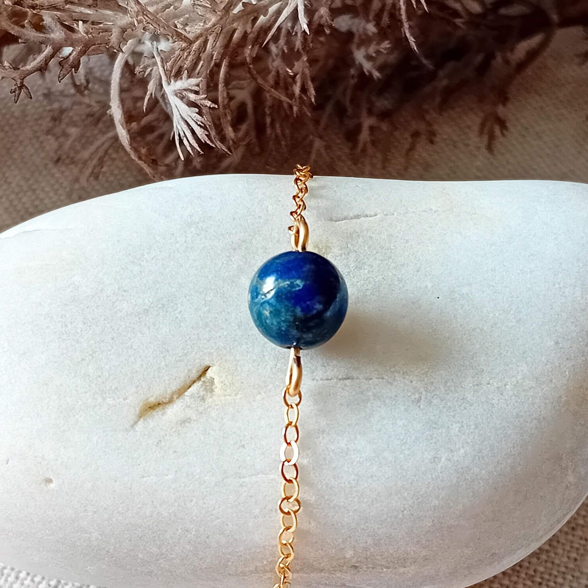 This minimalist Lapis Lazuli bracelet features a single, striking lapis lazuli stone, known for its deep, celestial blue hue and subtle golden flecks that capture the essence of the night sky. The delicate link chain is designed to compliment the natural beauty of the stone without overpowering it, creating a timeless piece.