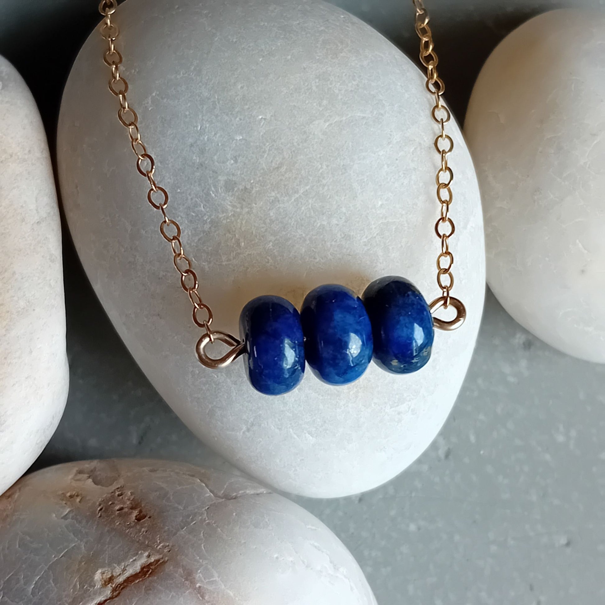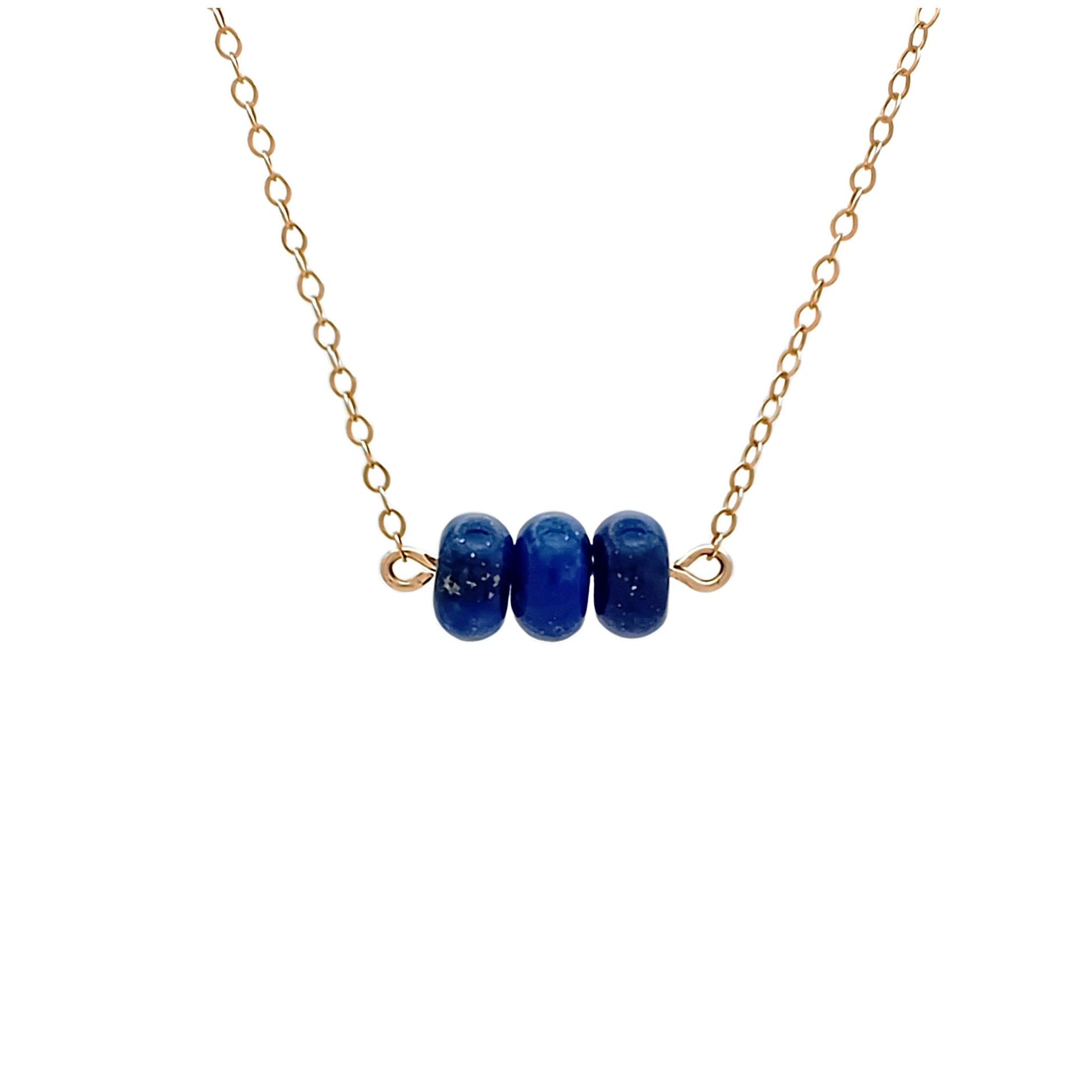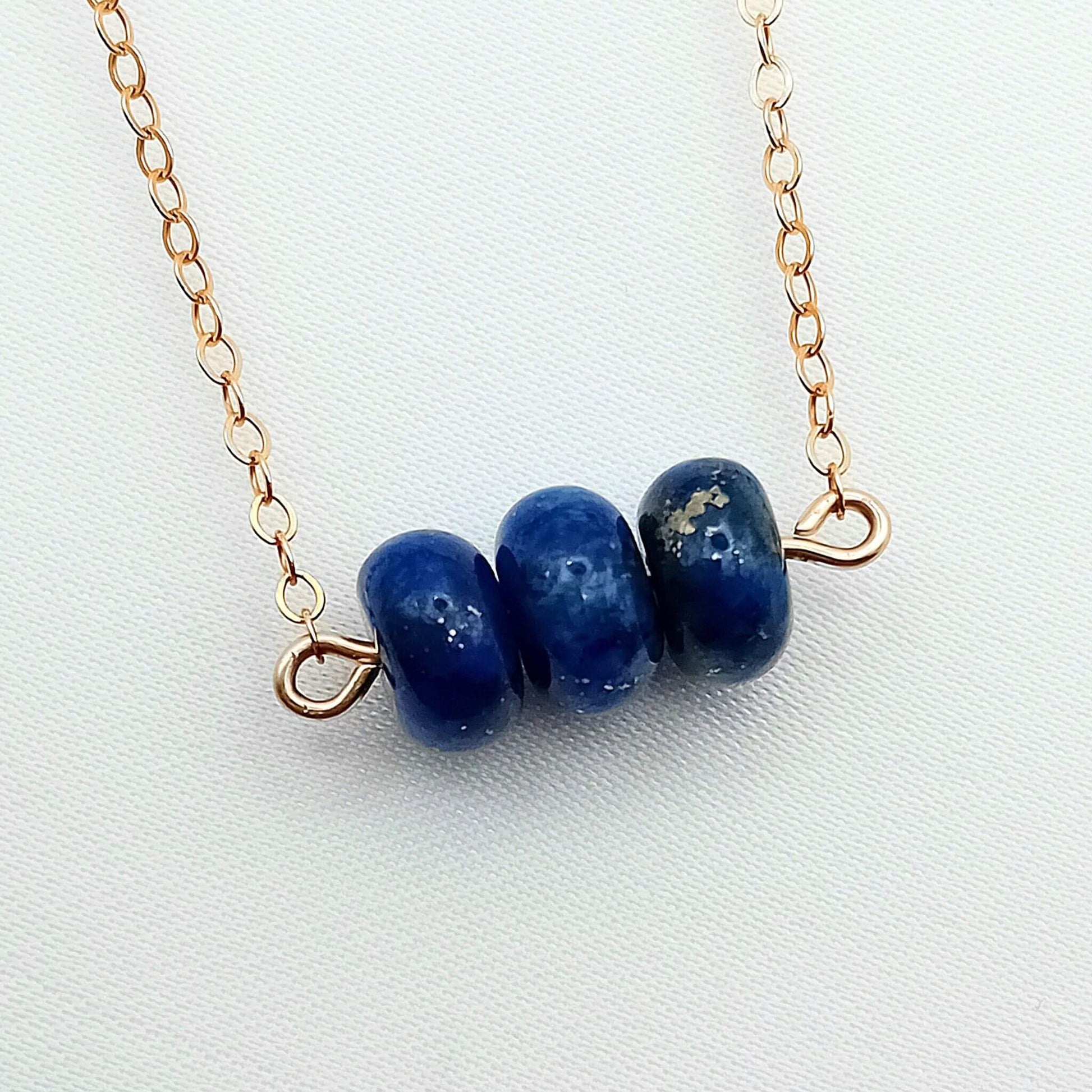 This genuine Lapis Lazuli necklace features three stunning lapis rondelle beads on a delicate, but durable 14k gold fill chain. The rich Lapis stones showcase their natural beauty with flecks of gold, perfectly paired with the gold fill chain.