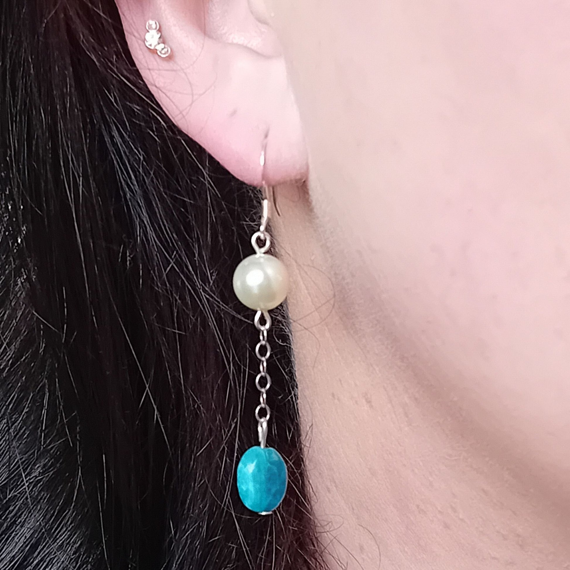 These handmade silver earrings feature a delicate drop design with ivory Swarovski pearls, shimmering sterling silver chain and a tranquil Larimar stone. The soft tones and flowing movement create a timeless look—perfect for special occasions or adding a touch of serenity to your everyday look.