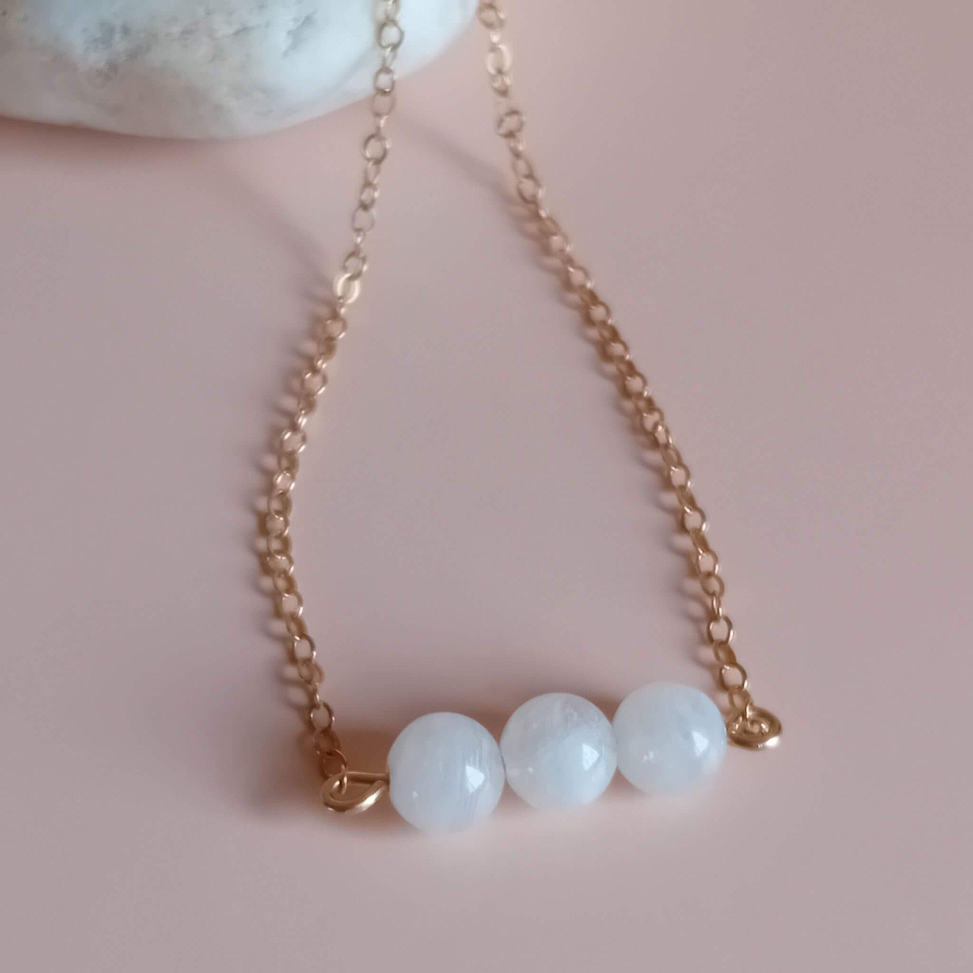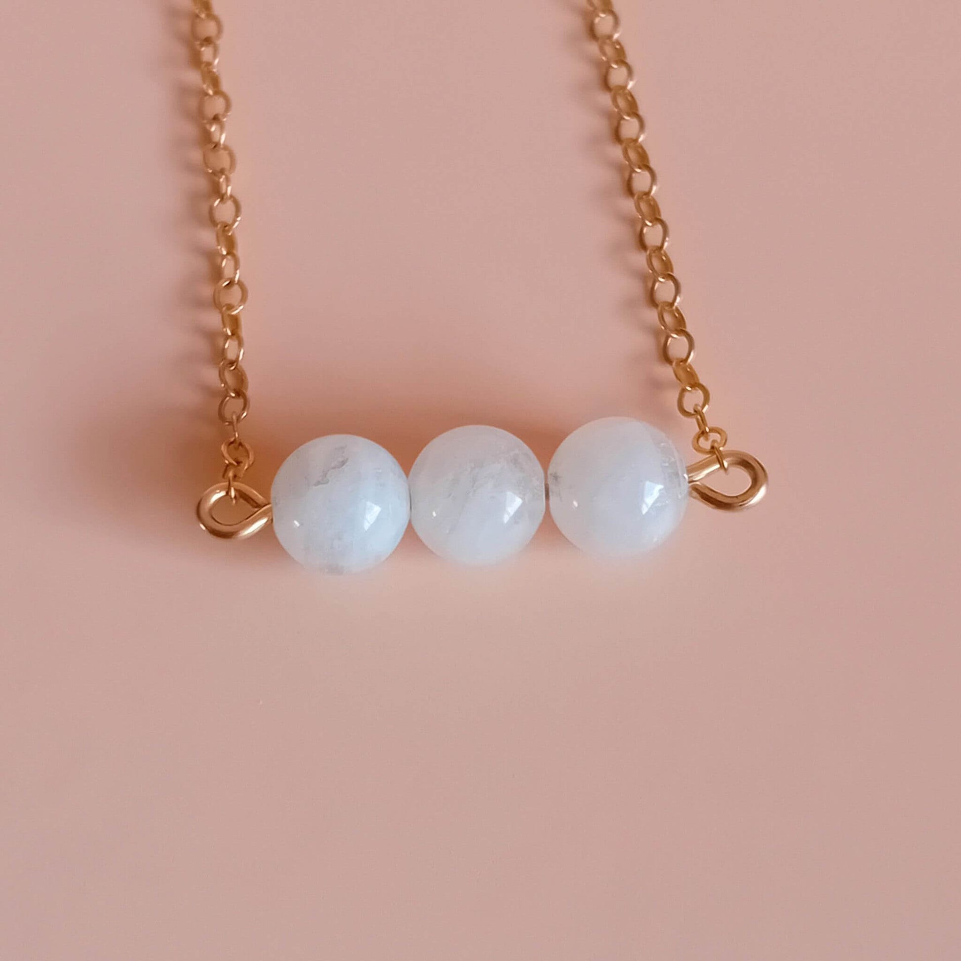 Experience the ethereal beauty of moonstone with our Moonstone 14k gold fill necklace. This stunning piece features three mesmerising moonstones on a delicate gold fill chain. Add a touch of magic to your jewellery collection with this timeless and captivating piece.