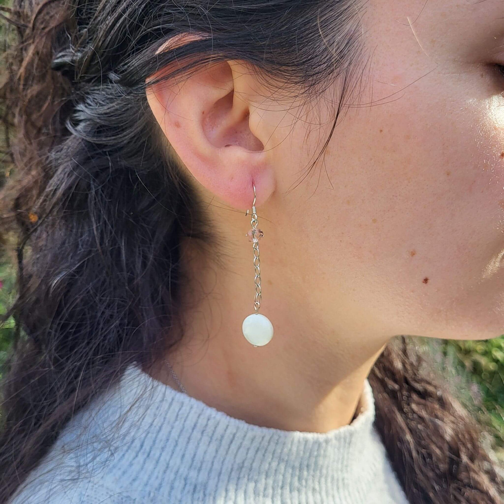 Handmade drop earrings, crafted for lovers of minimalist and dainty jewelry. Each earring features a light pink faceted crystal, catching the light with a subtle sparkle, paired with a lustrous mother of pearl accent. The delicate design is completed with a textured sterling silver chain. Lightweight and versatile, these earrings are perfect for any occasion.