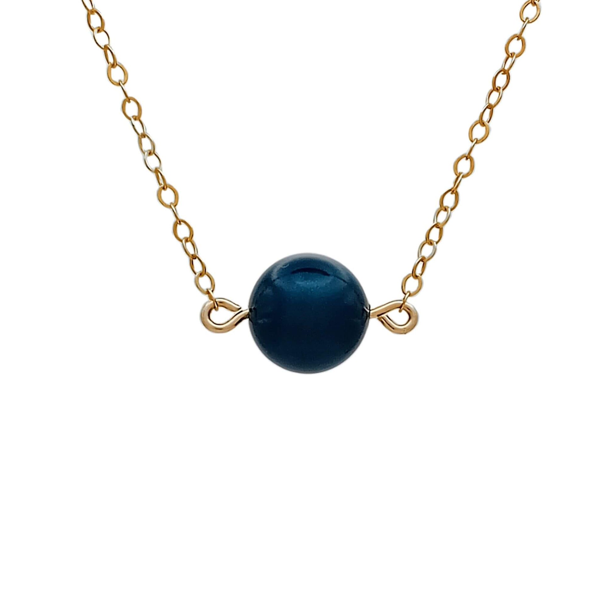 This Swarovski pearl necklace has a striking deep petrol blue pearl set on a delicate 14k gold fill chain. Simple yet eye-catching, this piece can be worn on its own to add a pop of colour to your look.