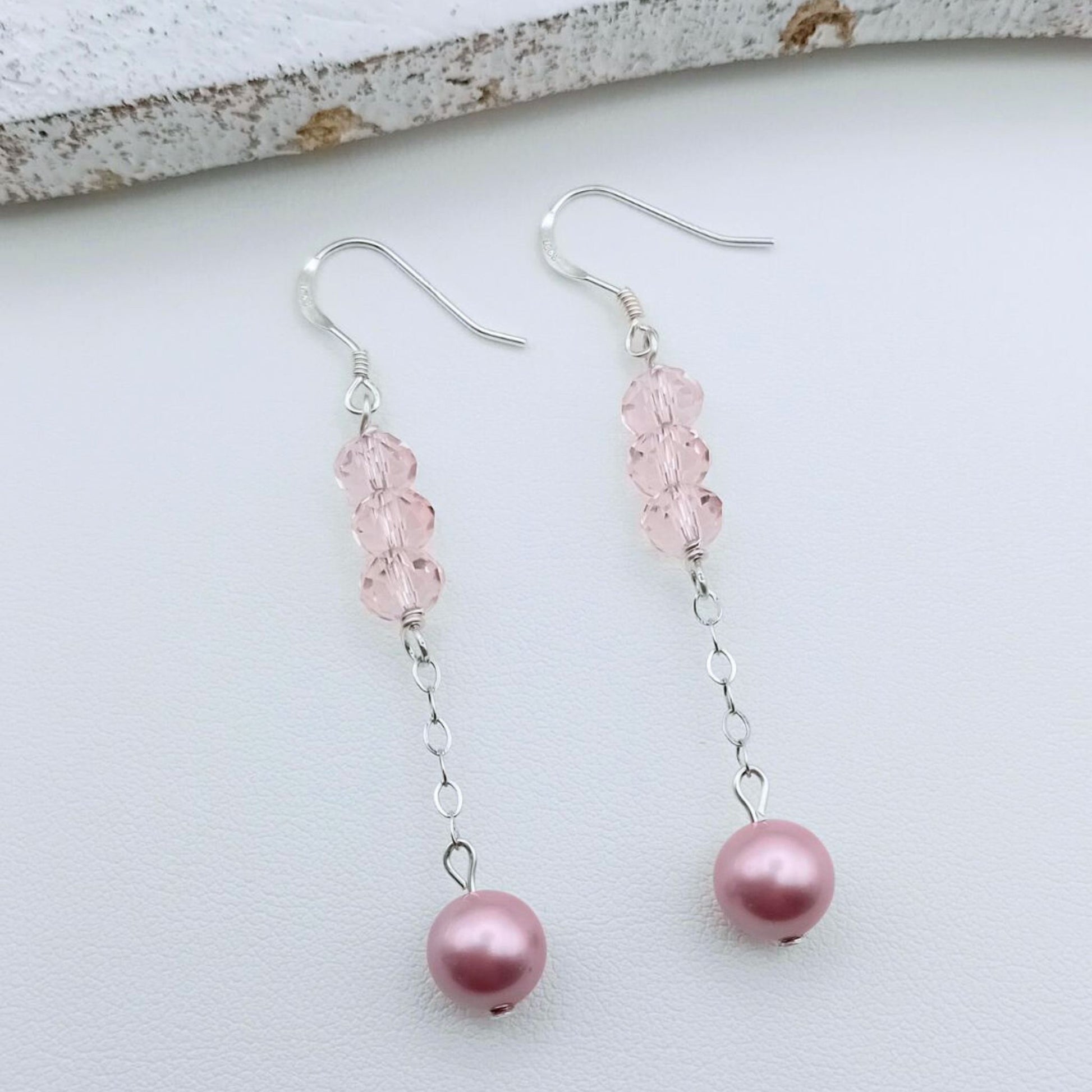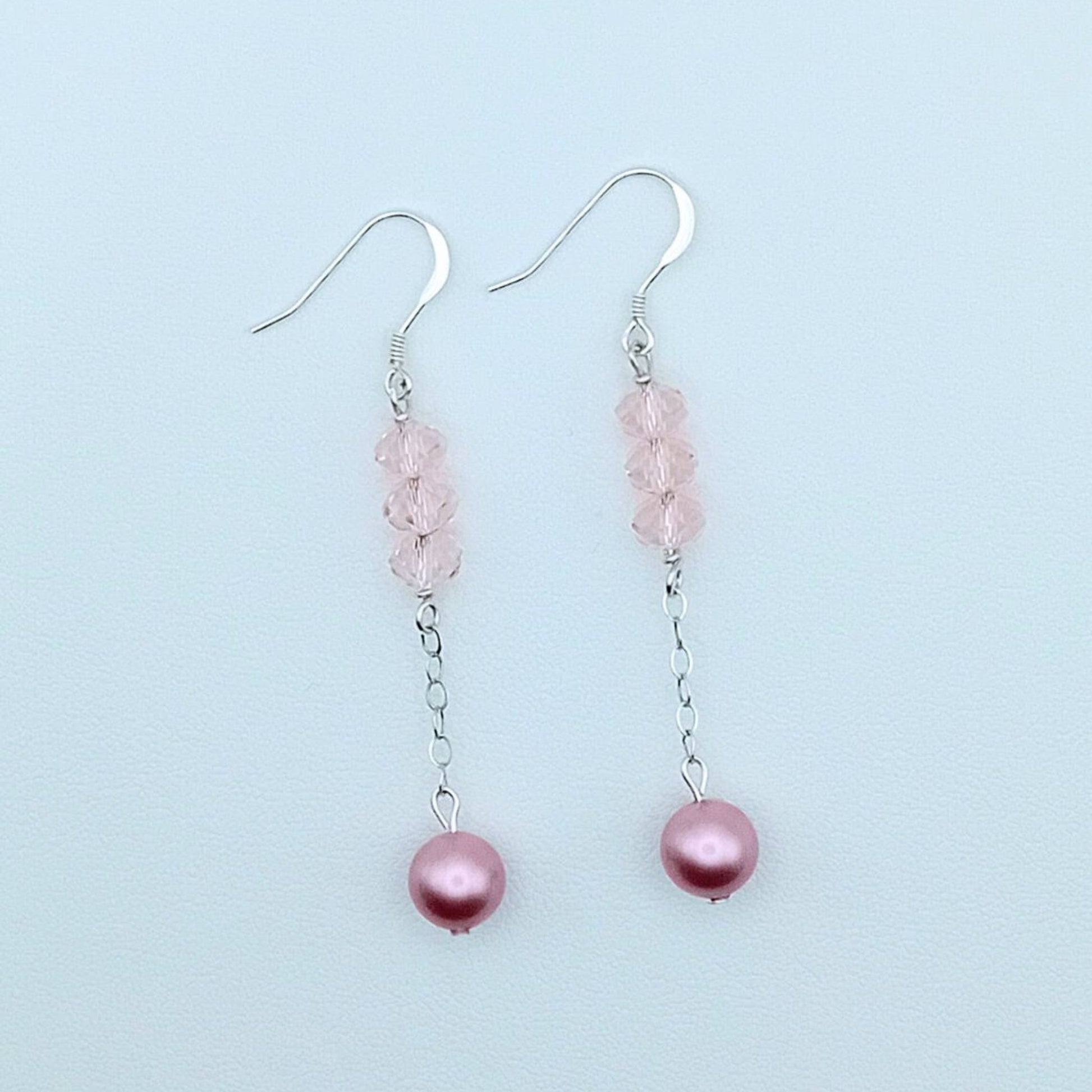 Add a touch of sparkle to your day with these handmade silver earrings. Delicately crafted with three shimmering pink Swarovski crystals, each earring features a drop design finished with a soft pink Swarovski pearl. Lightweight & durable, these earrings are perfect for both special occasions and everyday glam.
