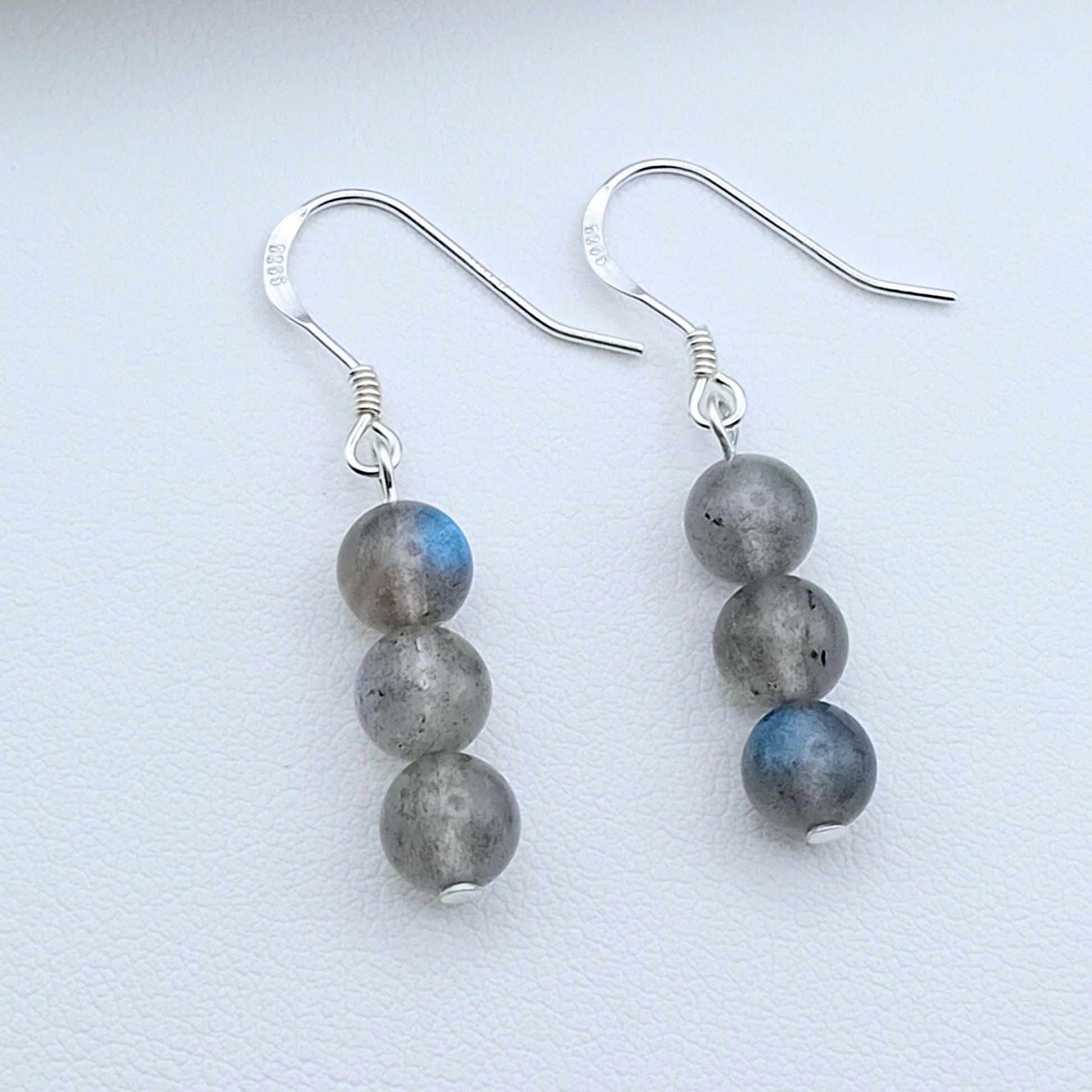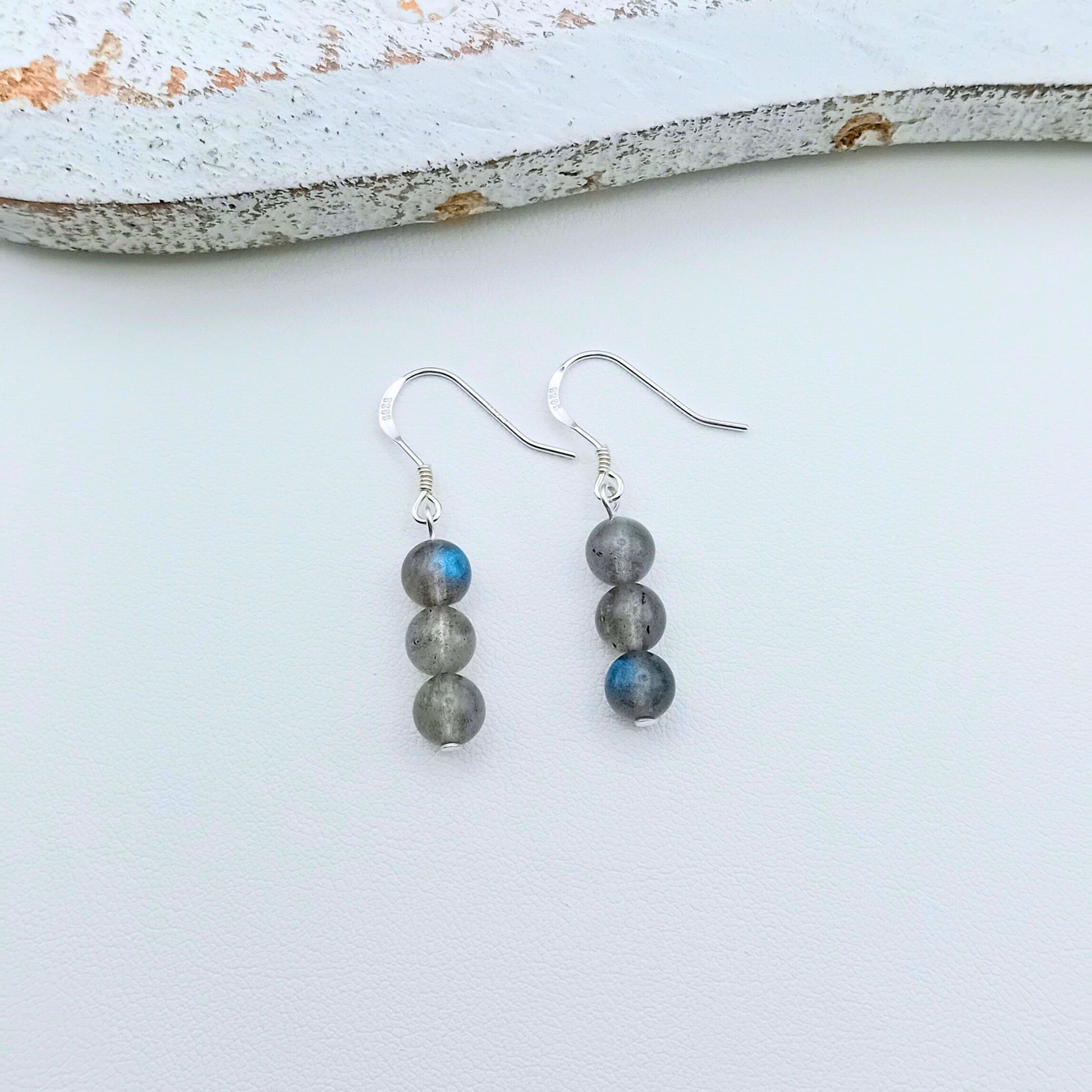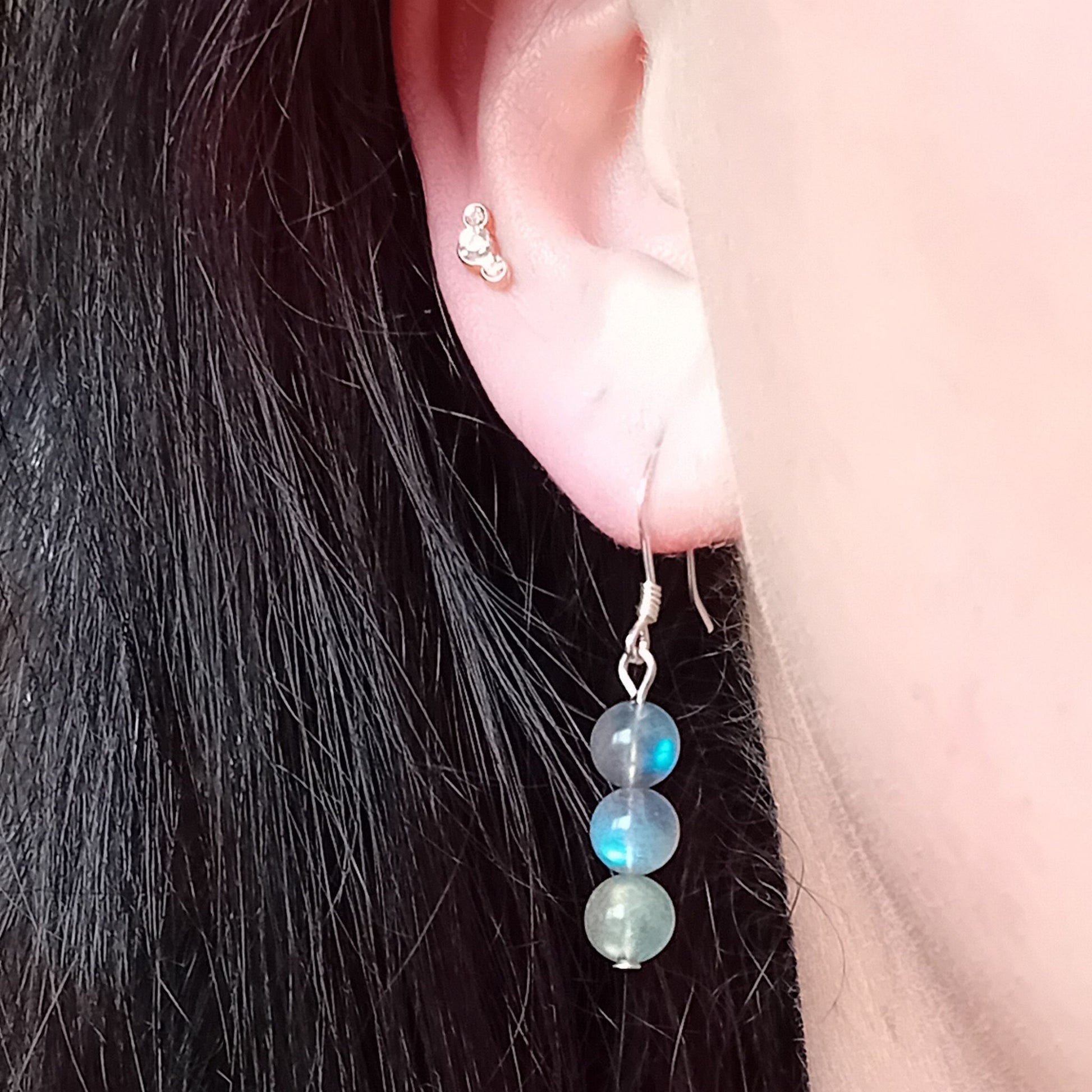 These handmade sterling silver earrings showcase three labradorite stones with natural flashes of blue and grey. The sleek, minimalist design lets the gemstones take centre stage, offering just the right amount of shimmer and movement. Lightweight and versatile, they're perfect for everyday wear or adding a subtle statement to any outfit.